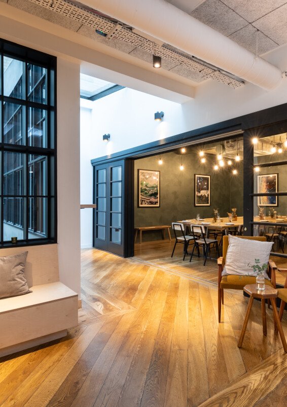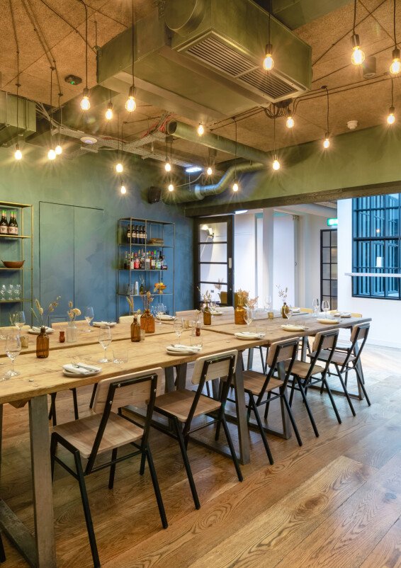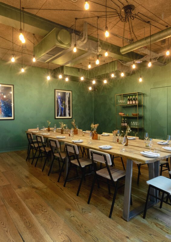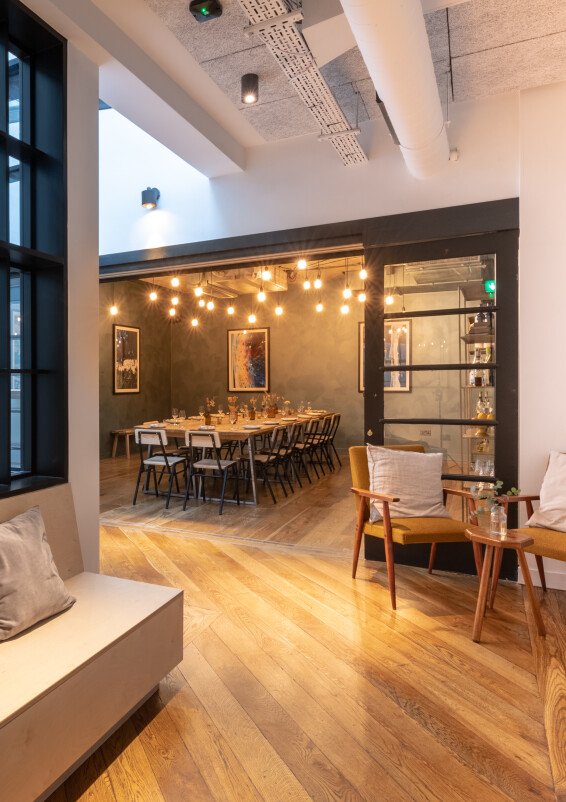 Serving seasonal snacks and small plates from our acclaimed wine bar downstairs, our stylish private dining room - AKA the 'Green Room' - is the ideal space for intimate lunches and dinners for up to 30 guests. Flooded with natural light and equipped with all the AV you'll need for daytime meetings and away days, the space comes to life in the evening with its constellation of exposed industrial bulbs, dramatic artwork and sliding glass panelled doors. The Green Room also has its own lobby area overlooking Carousel's double-height atrium, complete with built-in banquette seating; perfect for welcome drinks, break out meetings and catch ups between courses with old friends.